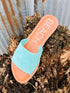Turquoise suede summer slides...your summer sandal staple. If in between sizes, it is recommended to size up as there are not half sizes.