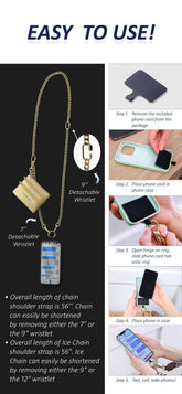 This comfortable, adjustable crossbody shoulder chain offers more than meets the eye! The multifunctional design converts the crossbody into a wristlet or can be used as a fashion strap on a purse. The included phone card is easily tucked into the back side of your own phone case through the charging hole, leaving enough room to use your charging port as normal. The Clip & Go acts as body jewelry while keeping your phone close at hand, allowing you to go hands free with ease. Your phone can hang at your side hands free, while the included innovative hanging phone card, convenient zippered change pouch and detachable wristlet combine to create a product that has an undeniable appeal.
