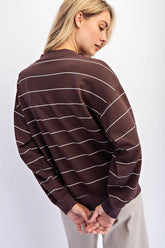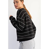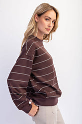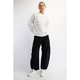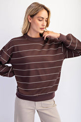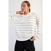 A timeless essential-this striped long sleeve top is crafted from silky smooth modal poly fabric for everyday comfort. Featuring a classic crew neckline and a clean, minimal silhouette, it's lightweight, breathable, and effortlessly versatile for layering or wearing on its own. Features: - Stripe yarn dyed Modal Poly Span Scuba fabric - Silky smooth and Lightweight - Relaxed fit - Long sleeve - Dropped shoulder - Crew neck Model is 5'8" and wearing size Small. Fabric: 39% Rayon, 2% Modal, 54% Polyester, 5% Spandex (Only Cream/Black : 39% Modal, 2% Rayon, 54% Polyester, 5% Spandex) C.O.O: Import